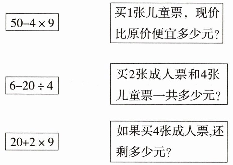 3. 萱萱带50元钱去公园玩。成人票每张9元,儿童票原价每张6元,现价4张20元。下面算式分别表示什么意思?连一连。