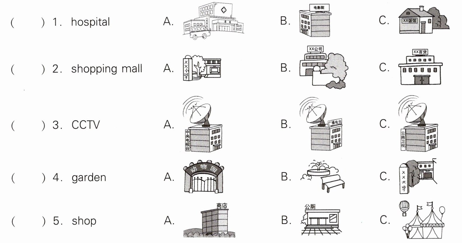 1. 旅馆;酒店 2. 书房 3. 电影院 4. 银行 5. 厨房