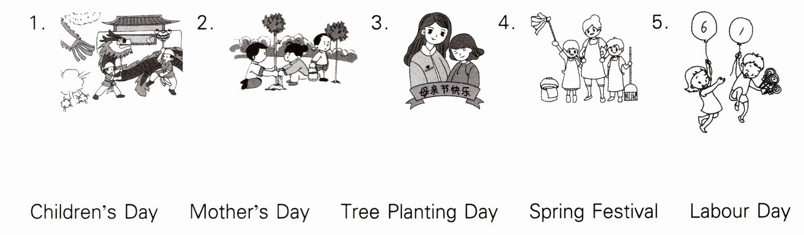 1-Spring Festival; 2-Tree Planting Day; 3-Mother’s Day; 4-Labour Day; 5-Children’s Day