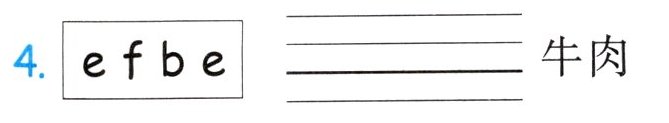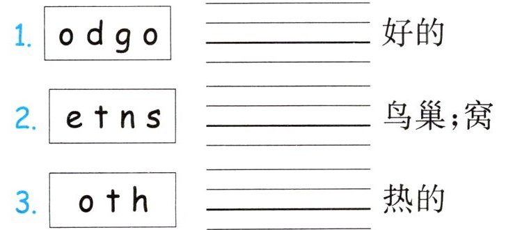 三、根据中文意思,把方框内的字母重新排列成单词,并写在四线三格内。