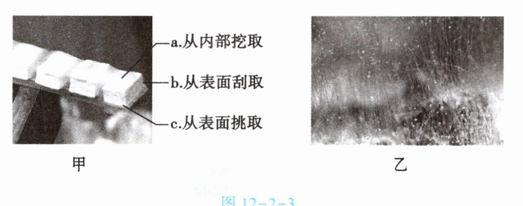 (2) 同学们制作临时装片对毛霉进行观察,图 12-2-3 甲中取材方式最恰当的是______(填“a”“b”或“c”),在显微镜下观察图 12-2-3 乙,可见其主要由______构成。