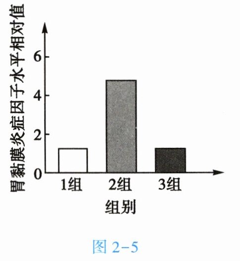 (3)研究者将实验小鼠平均分为三组,每组若干只,按下表进行处理,以探究幽门螺杆菌与胃黏膜炎症的关系,以及乳酸菌对幽门螺杆菌的影响。一段时间后检测三组小鼠胃黏膜炎症因子水平相对值(炎症因子水平相对值越高,炎症越严重),并计算出每组的平均值,结果如柱状图 2-5 所示。
