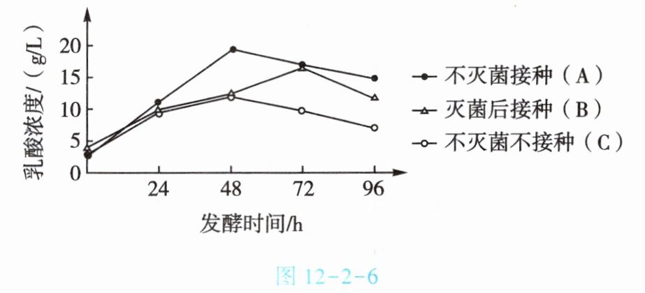 ②将三份处理后的培养基都放置于无氧、35℃环境下发酵,每隔24h取样并分析乳酸浓度,根据所得数据绘制折线图,如图12-2-6所示。