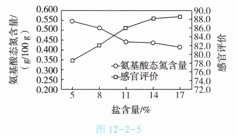(5) 腐乳品质评定是通过检测氨基酸态氮含量(以氨基酸形式存在的氮元素的含量,含量越高,鲜味越浓)和感官评价来进行综合评定的。腐乳营养价值丰富,但因其较高的含盐量而严格控制摄入量影响其功能性发挥,科研人员通过实验研发含盐量低同时又保持产品质量与风味的低盐腐乳,据图12-2-5分析,盐含量在______时较适宜。