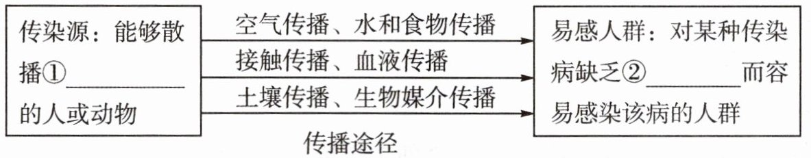 |传染源:能够散播①______的人或动物|空气传播、水和食物传播|易感人群:对某种传染病缺乏②______而容易感染该病的人群|