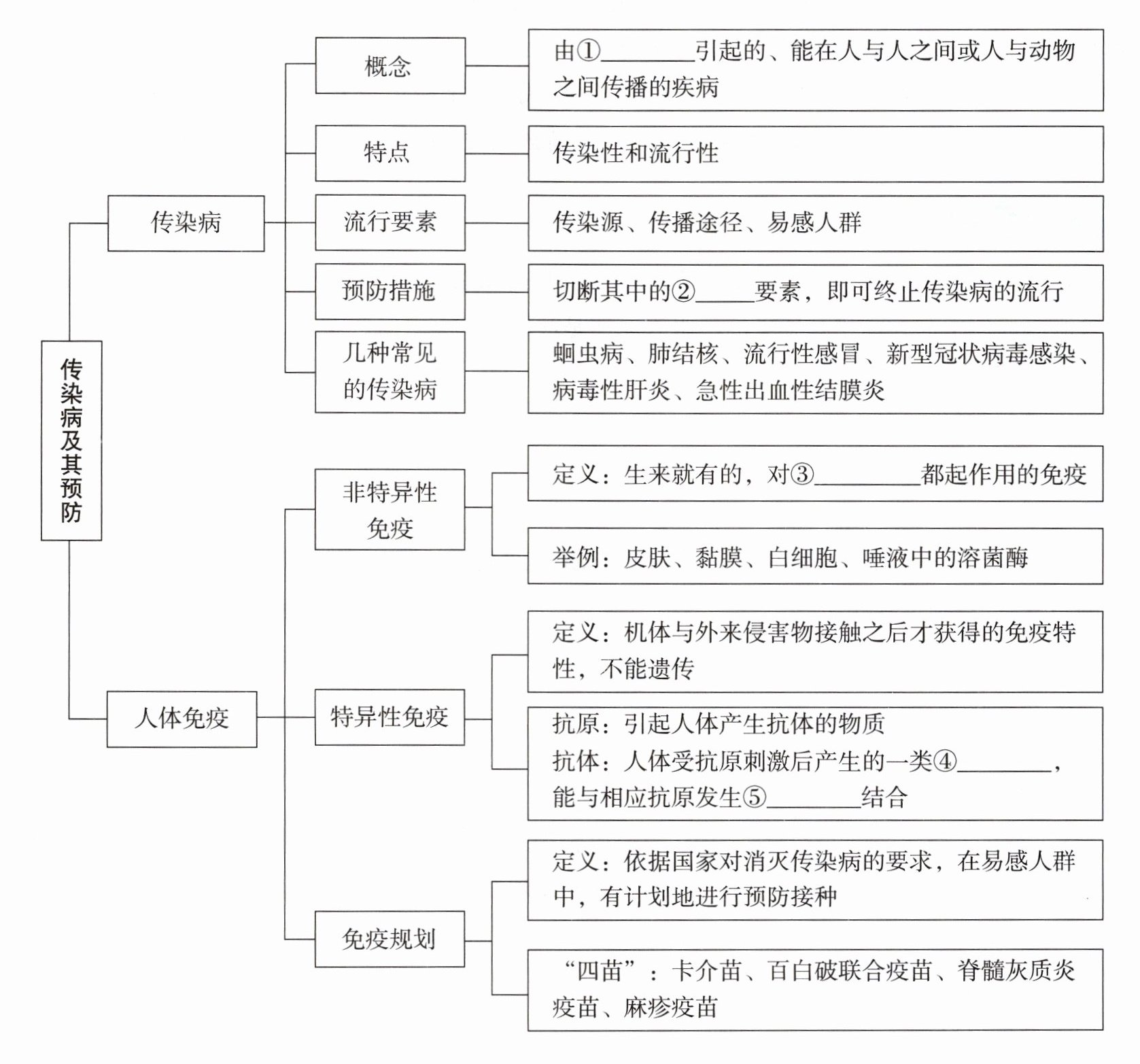 预防措施:切断其中的②______要素,即可终止传染病的流行
