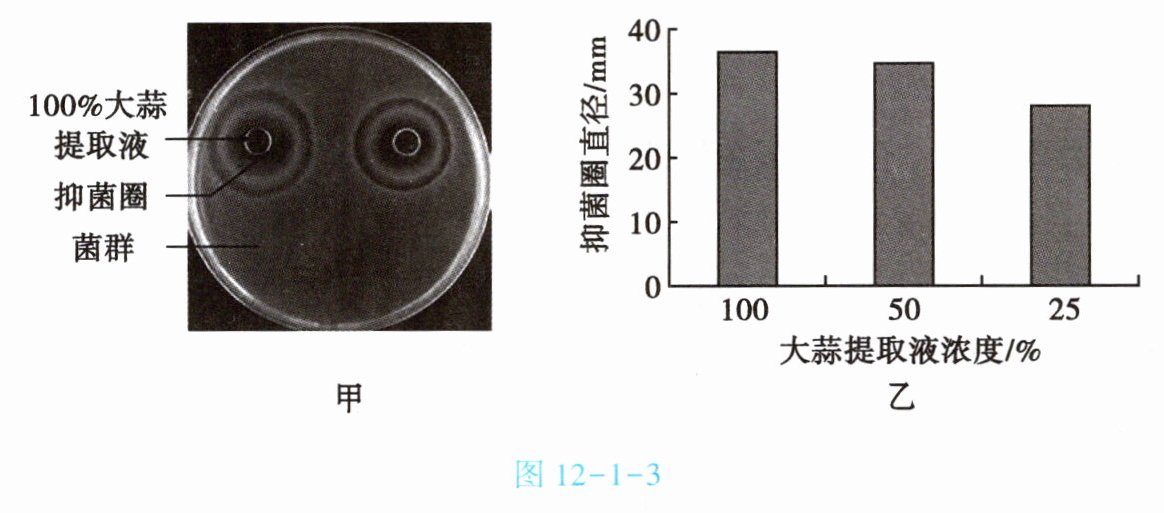 (3) 图 12 - 1 - 3 甲中加入 100%大蒜提取液后,周围出现了抑菌圈,说明大蒜可以______。据图 12 - 1 - 3 乙可知,效果最佳的大蒜提取液浓度是______。