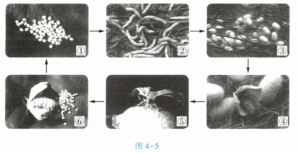 21. (8分)生物通过生殖和发育使得生命世代相续,且生生不息,家蚕的生长发育过程如图4-5所示,请认真分析并运用所学知识完成下列各题。