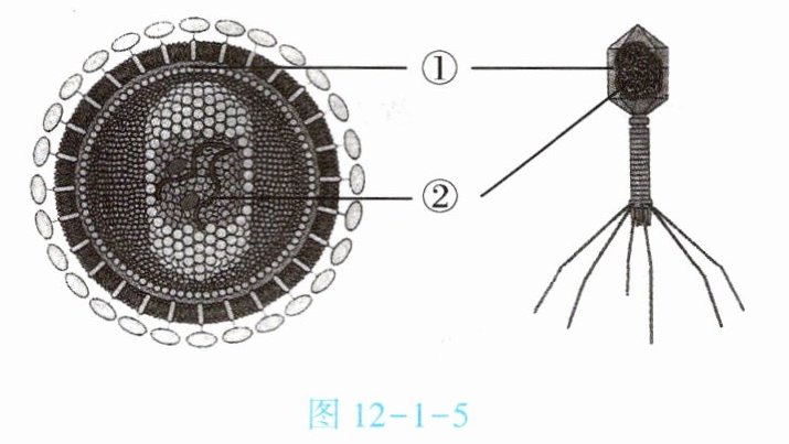 5. 病毒没有______结构,不能独立生活,必须寄生在其他生物的______内。如图 12 - 1 - 5 所示,所有病毒都有相似的两部分结构:①______;②______。