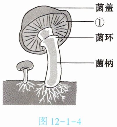 4. 蘑菇也是由许多______组成的。如图 12 - 1 - 4 所示,在菌盖下面的①______部位能够产生______。
