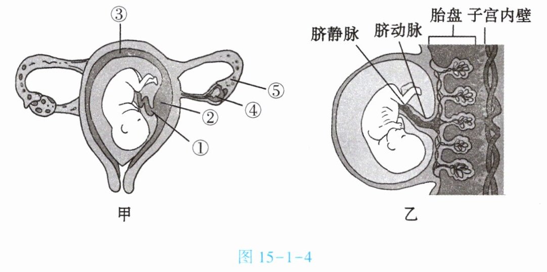 12. 新生命的孕育由生殖系统完成。图 15 - 1 - 4 甲是女性生殖系统结构示意图,图 15 - 1 - 4 乙是胎儿、脐带和胎盘示意图,请分析回答下列问题。