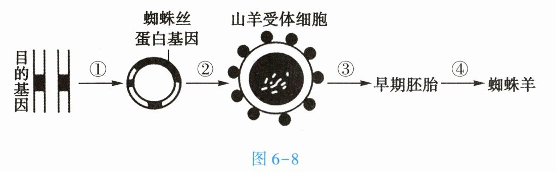 材料二 科学家利用生物作“生产车间”,生产人类所需要的某些物质,这就是“生物反应器”。具体的做法是他们先提取到蛛丝蛋白基因,将其注入山羊受精卵并整合到细胞核中的染色体上,培育出早期胚胎,再将胚胎移植到代孕母羊的子宫中,等山羊出生长大它就具备了“产丝”能力(如图 6 - 8 所示)。