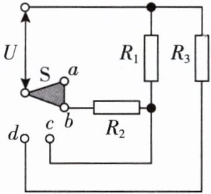 4. (双选)如图为某款电加热器的简化电路图,$R_{1}$、$R_{2}$、$R_{3}$为定值电阻,$a$、$b$、$c$、$d$为金属触点,$S$为旋钮开关,转动旋钮可以将相邻两个触点连通。则开关(