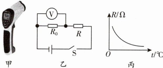5. 测体温时,通常使用图甲所示的非接触式红外线测温枪。图乙是它的工作原理图,$R_{0}$是定值电阻,$R$是红外线热敏电阻。$R$的阻值随人体温度变化的图像如图丙所示。闭合开关$S$后,下列对该电路的分析错误的是(