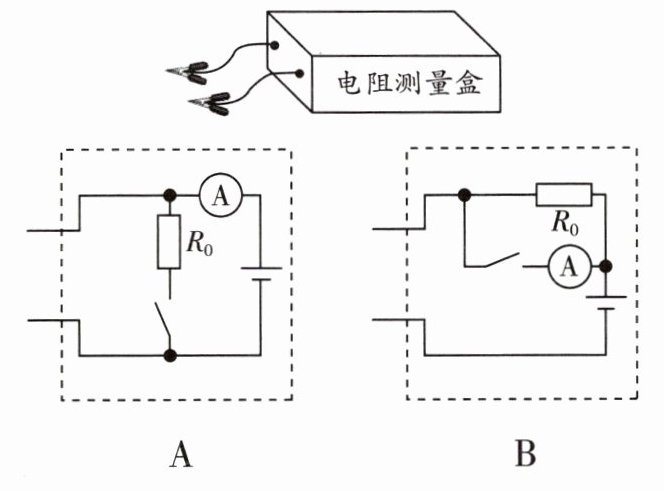 7. (双选)如图所示的“电阻测量盒”,内有电源(电压不变且未知)、阻值已知的定值电阻$R_{0}$、开关和电流表,并引出两根导线到盒外。将盒外的两根导线分别与待测电阻$R_{x}$的两端相连,根据开关闭合、断开时电流表的示数,可以计算出$R_{x}$的阻值。下列设计的盒内电路图符合要求的是(
