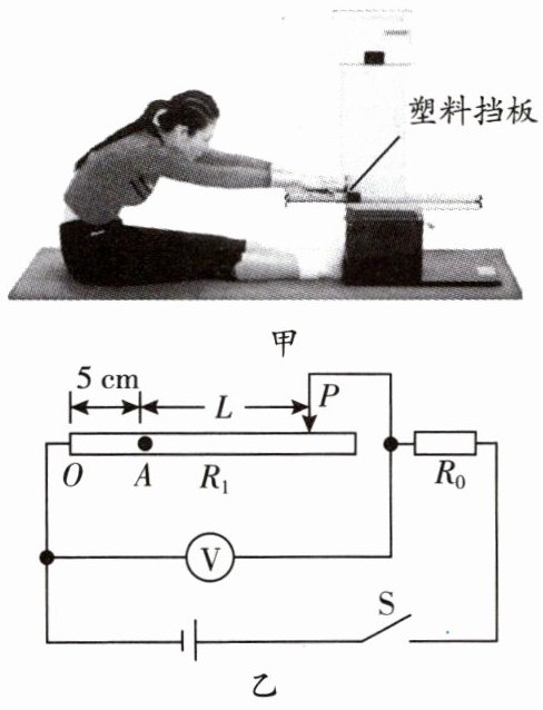 6. “坐位体前屈”是学生体质健康测试项目之一。图甲是某女生测试示意图,图乙是学习小组设计的测试仪电路原理图,电源电压恒为$4.5V$,电压表量程为$0\sim3V$,定值电阻$R_{0}= 10\Omega$,滑动变阻器$R_{1}由长为30cm$、粗细均匀的电阻棒改装而成,规格为$1\Omega/cm$,允许通过的最大电流为$0.3A$。为保护电路安全,滑片$P的起始位置A点设定在离电阻棒最左端O点5cm$处。测试时,通过推动塑料挡板带动滑片$P从起始位置A$向右移动,并通过电压表的示数反映学生的测试结果。下表是九年级女生测试等级与滑片$P移动距离L$的关系。