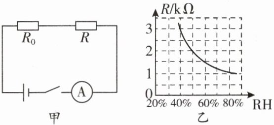 14. 如图甲所示的电路是小明设计的一款电子湿度计,其中电源电压恒为$6V$,$R_{0}是阻值为1000\Omega$的定值电阻,$R$为湿敏电阻,其阻值随空气湿度的变化关系如图乙所示。从湿度计(由小量程电流表改装而成)指针所指刻度可知湿度大小。由此可知,当空气中的湿度增大时,指针所指湿度对应的电流表示数将