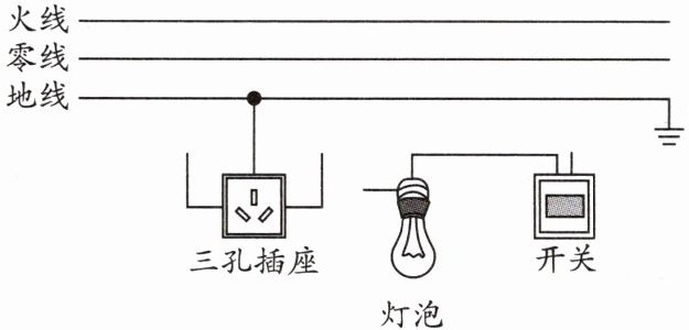 7. (2025·河南)下图是家庭电路的一部分,三孔插座可单独工作,开关控制灯泡。请用笔画线表示导线,将对应的电路连接完整,并符合安全用电原则。
