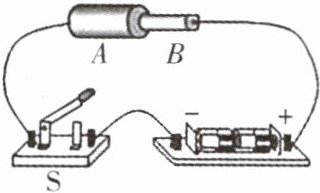 7. 如图所示,导体 $ A $、$ B $ 是由同种材料做成的,$ A $ 和 $ B $ 等长,但 $ A $ 比 $ B $ 的横截面积大。当 $ S $ 闭合后,在相同的时间内,下列叙述正确的是(