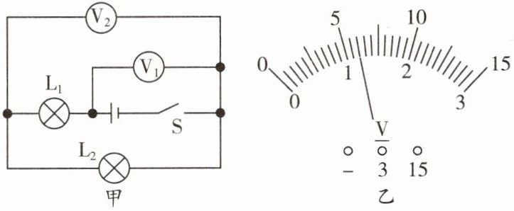 。<!-- 甲为电路图,两灯串联,V1测L2电压,V2测电源电压;乙为电压表,0-15V量程分度值0.5V,指针指向6V;0-3V量程分度值0.1V,指针指向1.2V -->