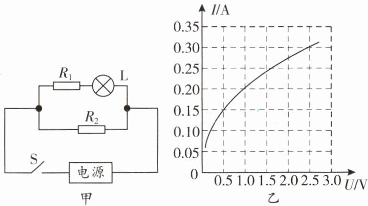 8. 如图甲所示,电源电压可调,$R_{1}$、$R_{2}$为定值电阻,小灯泡的额定电压为 2.5 V,图乙是该小灯泡的 I - U 图像。闭合开关 S,把电源电压调到 4 V,$R_{2}$的电功率为 0.8 W。