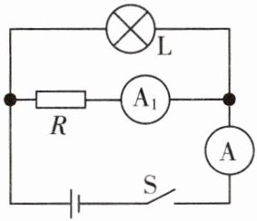 12. 如图所示的电路中,定值电阻$R的阻值为20\Omega$,电源电压保持不变。闭合开关$S$后,电路正常工作,电流表$A_{1}的示数为0.2A$,电流表$A的示数为1A$。求: