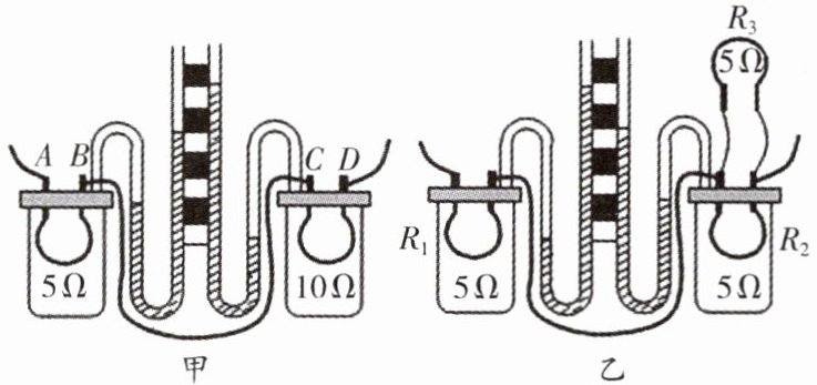 (选填“左”或“右”)侧容器相连的$U$形管中液面的高度差较大。(2) 观察乙装置,