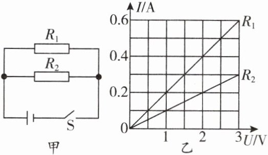 3. 两个定值电阻$R_{1}$、$R_{2}$并联在电路中,如图甲所示,它们的电流与其两端电压的关系如图乙所示,闭合开关$S$,则$R_{1}$、$R_{2}$产生的热量之比为(