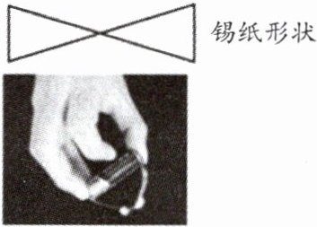 2. 如图所示是一种简易点火装置,将一张锡纸剪成中间窄、两端宽的形状,再将锡纸两端分别与干电池的正负极连接。过一会儿,看到锡纸中间部分燃烧起来,这是因为锡纸是
