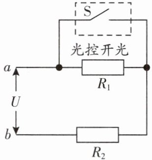 4. 某兴趣小组模拟冬季温房自动化加热和保温的电路如图所示。光控开关$S$因光照改变会自动通断,该电路具有白天保温、晚上加热的特点。$R_{1}$、$R_{2}$为电热丝,$a$、$b间电压U = 24V$,$R_{1} = 72\Omega$,晚上电路的发热功率为$12W$。则:保温时$S$应处于