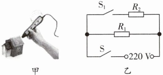 1. 如图甲所示的打印笔有快慢两挡,其内部简化电路如图乙所示,$R_{1}$、$R_{2}$是用于发热的定值电阻。工作时,$3D$打印笔通过加热,挤出热熔的塑胶,然后在空气中迅速冷却,最后固化成稳定的形状。某次使用慢挡打印$10min$,刚好将$30g的塑胶从20^{\circ}C加热到120^{\circ}C$。已知该打印笔慢挡打印功率为$22W$,塑胶的比热容为$2.2×10^{3}J/(kg\cdot^{\circ}C)$,则(