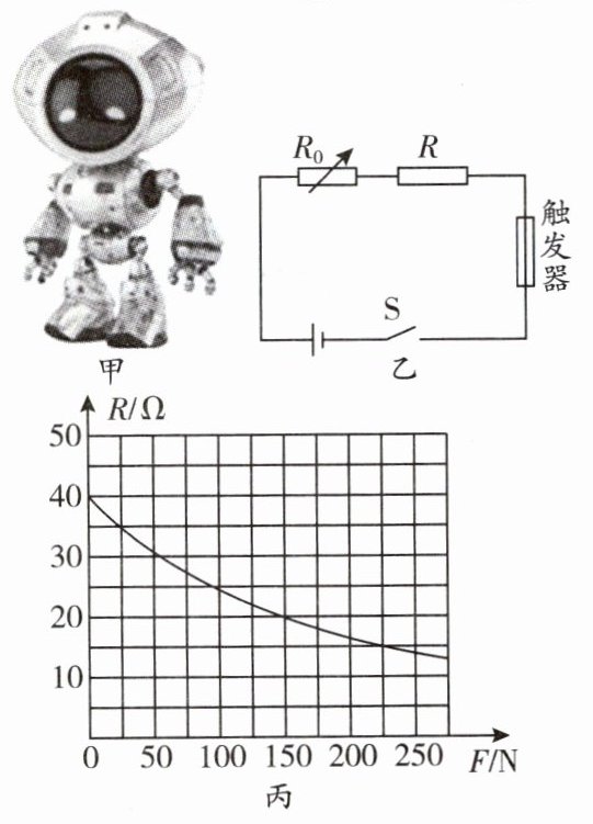 (2) 如图乙所示为小$K$送餐时其内部电路原理图,电源电压为$30V$,图中$R$为餐盘下的压力传感器,其阻值随所受压力变化图像如图丙所示,图乙中触发器的电阻忽略不计,电阻箱$R_{0}两端的电压超过24V$时,触发电动机停止工作,放弃执行送餐的指令,以免小$K$损伤。为保护小$K$,电阻箱$R_{0}$的阻值为多少?