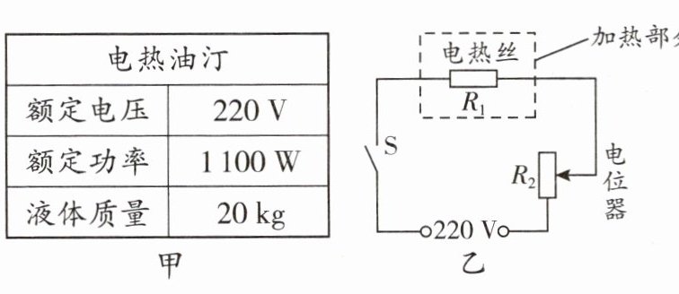 (3) 为了使电热油汀的实际加热功率可以调节,他找来一个旧的电位器(滑动变阻器),经测试最大阻值只能调到$176\Omega$,将它串联在电路中对电热油汀进行改装,改装后的简化电路图如图乙所示。请你计算改装后电热油汀的最小加热功率。