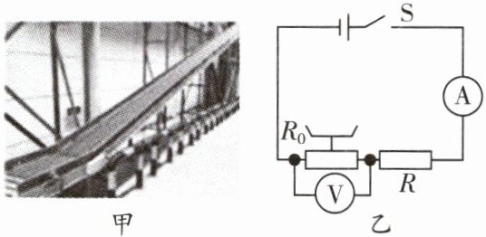 4. 如图甲为传送货物的传送装置。当传送带上某一位置放置的货物过重时,超限报警器就会报警,其电路简化原理图如图乙所示。电源电压恒定,其中 R₀ 为压敏电阻,其阻值大小随压力的增大而减小;电流表的示数超过设定值就会自动报警。下列说法正确的是(