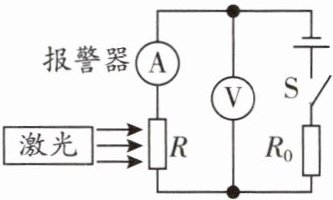3. 为保障安全,现在很多室内公共场所安装有烟雾报警装置。如图所示,是烟雾报警装置的简化原理图。电源电压保持不变,R₀ 为定值电阻,光敏电阻 R 的阻值随光照强度的减弱而增大,当电路中的电流减小至某一数值时报警器开始报警。闭合开关,当有烟雾遮挡射向光敏电阻 R 的光线时,下列说法错误的是(