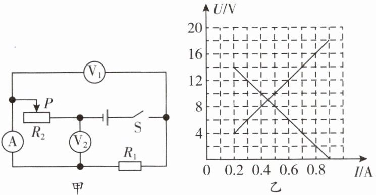 8. 如图甲所示,电路中的电源电压保持不变,闭合开关 S 后,将滑动变阻器的滑片 P 从左端滑到右端过程中,定值电阻$ R_1、$滑动变阻器$ R_2 $的 U - I 关系图像如图乙所示。下列说法正确的是(