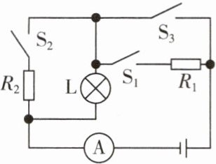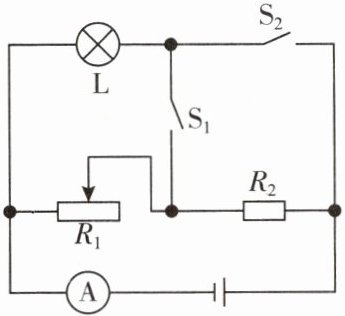 (2)当开关$S_{1}$、$S_{2}$都闭合时,$R_{2}$被短路,灯$L$与$R_{1}$并联,$L$恰好正常发光,电流表测干路电流且示数为$1.1\ A$,则有: