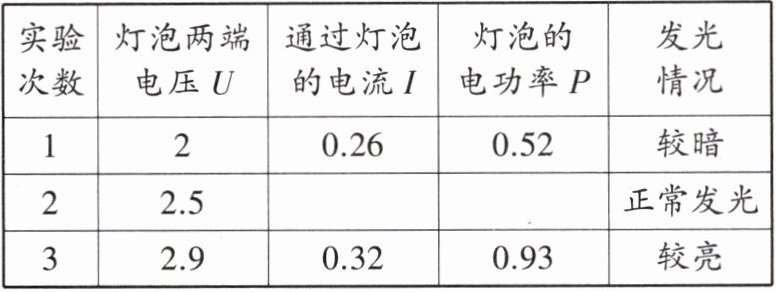 |实验次数|灯泡两端电压 U|通过灯泡的电流 I|灯泡的电功率 P|发光情况|