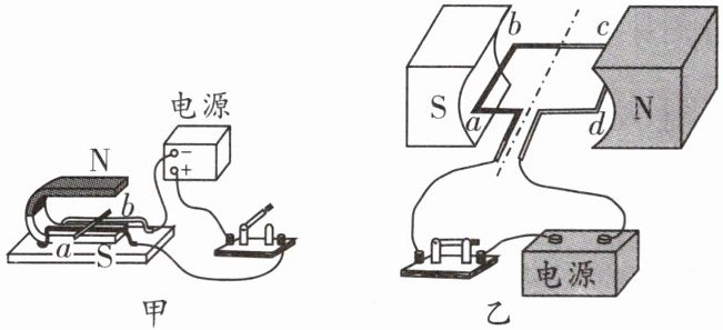 导体有力的作用。(2)仅将图甲中磁体的$N$、$S$极对调,闭合开关,导体$ab$向右运动,说明导体在磁场中的受力方向与