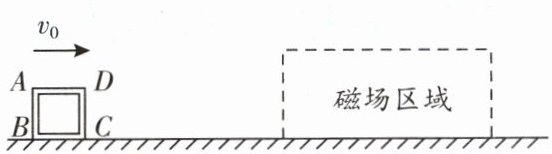 2. 如图所示,一个轻质铜框 ABCD 在光滑水平面上以速度 $ v_{0} $ 向右滑行,若要使铜框 CD 边进入磁场后、AB 边进入磁场前的过程中速度始终保持不变,应在水平方向上对其施加一个向左还是向右的拉力?请结合能量转化和力与运动的相关知识说明理由。