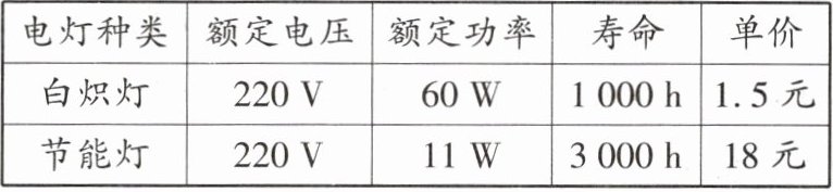 节能灯消耗电能:$W_{2}=P_{2}t_{2}=0.011kW×3000h=33kW·h$