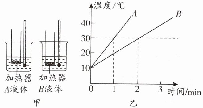第1 min时的比热容。 (3) 分析图乙可得,A、B两种液体的比热容大小之比$c_{A}$:$c_{B}= $