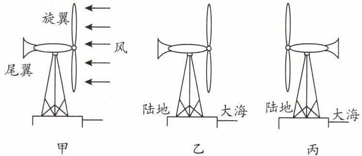 5. 家用小型风力发电机独特的尾翼结构,能使其旋翼自动迎风,如图甲所示。海边,仅在海陆风因素的影响下,图乙、图丙所示的情形通常分别发生在(
