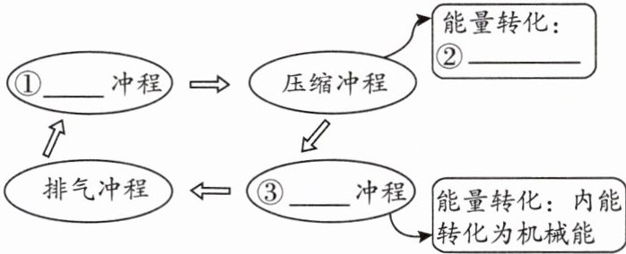 1. 学习完《热机》这节课后,小明作出如图所示的流程图来分析汽油机的四个冲程及其能量转化关系,请你帮小明将空白处的内容补充完整。