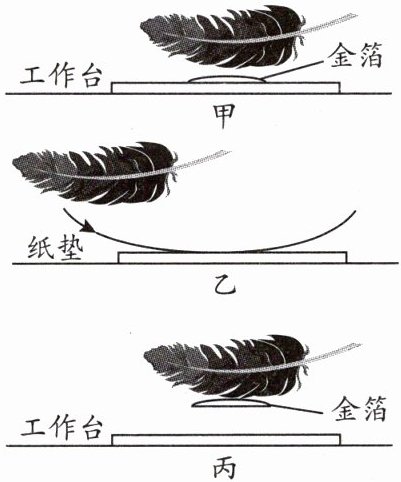 4. “金陵金箔”是国家级非物质文化遗产,手工打造的金箔轻薄柔软。如图甲所示,把羽毛靠近金箔,金箔仍静止在工作台上;接着手持羽毛轻轻扫过纸垫,如图乙所示;再次将羽毛靠近金箔,羽毛即可将金箔吸起,如图丙所示。下列说法正确的是(