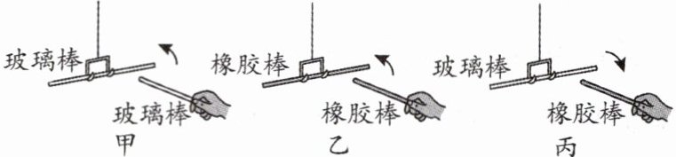 2. 在“探究带电物体间的相互作用”的活动中。用丝绸摩擦过的玻璃棒和用毛皮摩擦的橡胶棒,依次两两靠近,如图所示。甲、乙两图呈现相互排斥现象,丙图呈现相互吸引现象。