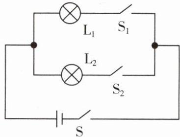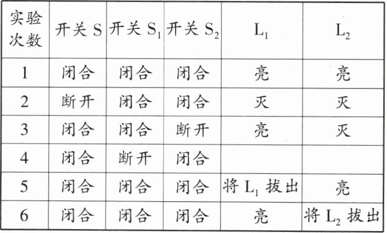 (4)在正确拆除完导线的基础上,两灯串联,他们闭合开关发现两灯同时亮,断开开关两灯同时灭;将开关 $ S $ 换接到 $ L_1 $ 和 $ L_2 $ 之间、$ L_1 $ 和电池正极之间,观察到同样