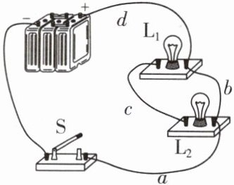 (填字母)这一根导线,就能成为串联电路。(4)在正确拆除完导线的基础上,两灯串联,他们闭合开关发现两灯同时亮,断开开关两灯同时灭;将开关 $ S $ 换接到 $ L_1 $ 和 $ L_2 $ 之间、$ L_1 $ 和电池正极之间,观察到同样