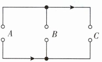 2. 如图所示,图中箭头表示接好的电路的电流方向,A、B、C 三处分别接有电源、电铃和电灯,则根据电流方向可知电源应接在(