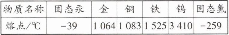 |物质名称|固态汞|金|铜|铁|钨|固态氢|